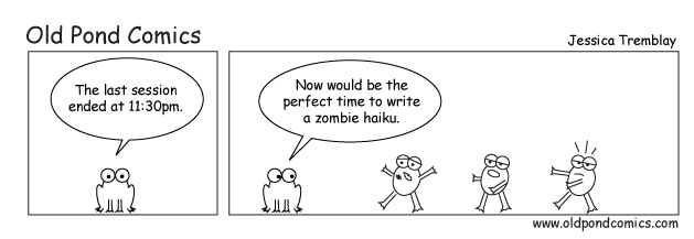 HNA is always jammed pack with activities, starting early in the morning, finishing late at night. This comic is also a reference to the session on Horror Haiku by Joshua Gage (author of a zombie haiku book).